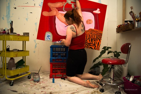 I am a contemporary artist who paints femme figures unapologetically resting, riding or raging. I create work for the female gaze, painting femme figures with agency, unapologetically resting, joyful, calm and in contemplation. Figures with straight backs and soft bellies. My art practice came out of a need to create a space of psychological safety, joy and comfort my own life after dealing with years of physical and mental health challenges – in my work I try to create for collectors what I struggle to give myself – calm, safety, rest and a safe space for anger and power. I caught long covid in 2022 and got thrown into dealing with ongoing chronic sciatic pain, in March 2024 I was diagnosed with endometriosis after 20 years of severe pain and symptoms being dismissed by doctors. This made me reassess my life and made me focus more on making art because I had no other outlets. I curated a show in 2025 showcasing others who have a similar experience called “What did they tell you” In 2025 also been late diagnosed with ADHD which is a whooole other story but am a journey of untangling what that means for me still.