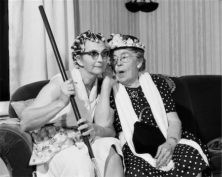 1950s – 1960s TWO ELDERLY WOMEN CHARACTERS GOSSIPING ONE WOMAN WITH HAIR CURLERS OTHER WITH HAT